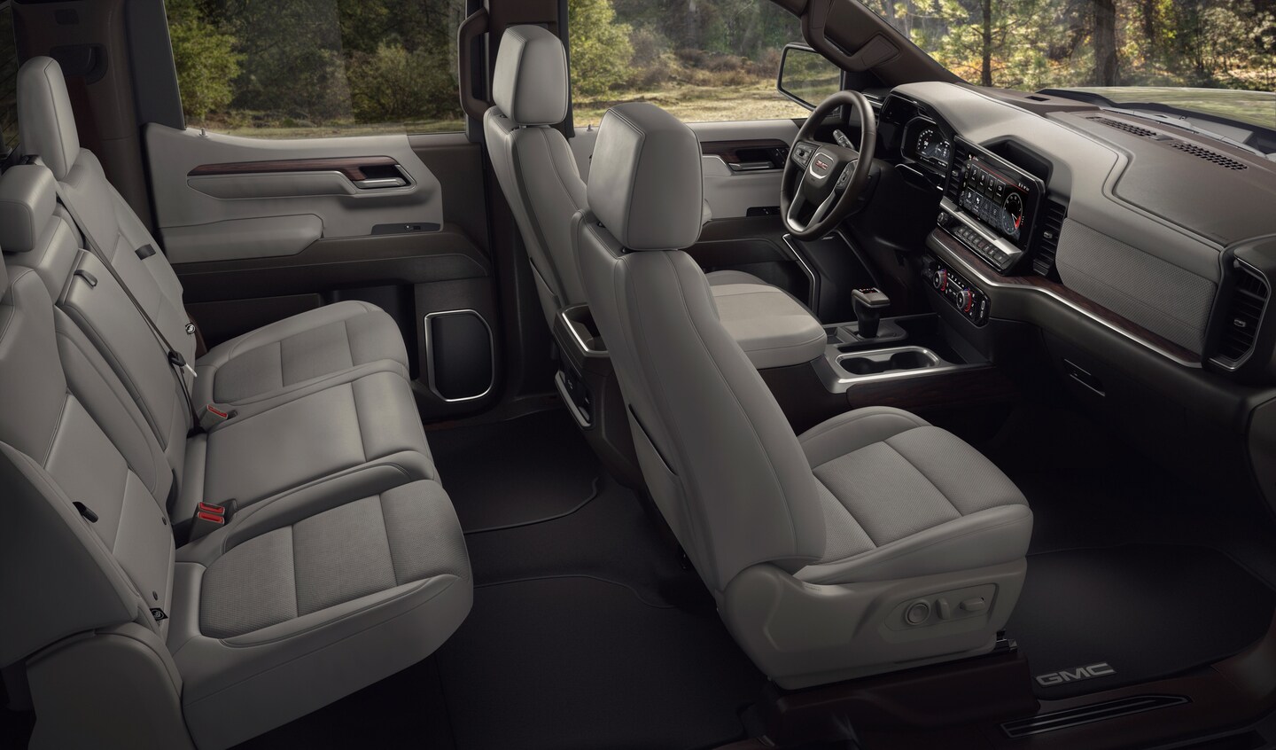 Step inside the GMC Sierra 1500, and you'll find a thoughtfully designed cabin that blends comfort with functionality. Seating options range from durable vinyl in the Pro trim to premium perforated leather in higher trims. The GMC Sierra 1500 offers multiple seating configurations, including 40/20/40 split-bench seats with covered armrest storage and available front bucket seats with center console.