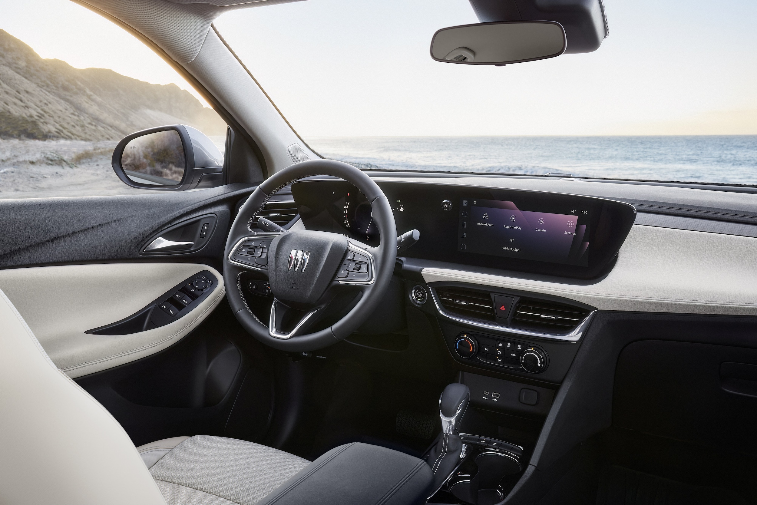 Inside the all-new Buick Encore GX, comfort meets functionality with thoughtfully designed spaces for five passengers. The Preferred trim features cloth with leatherette seating surfaces, while the Sport Touring upgrades to full leatherette appointments. The premium Avenir trim showcases perforated leather-appointed seats with available heating for both driver and front passenger positions.